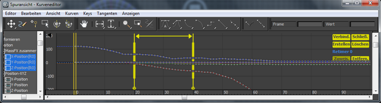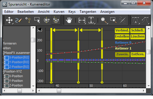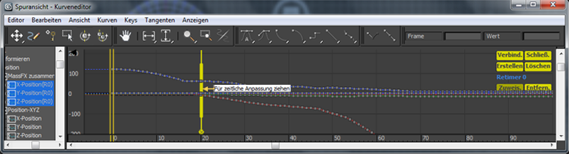 Dadurch wird die Animation der markierten Spuren aus dem Einfluss des Retimers entfernt. Der Retimer bleibt vorhanden, kann jedoch nicht mehr die Bewegung des Objekts beeinflussen. Die Kurven des Objekts verschwinden aus dem Key-Fenster. Dies zeigt an, dass die Animation nicht mehr mit einer Bearbeitung mit diesem Retimer unterliegt.