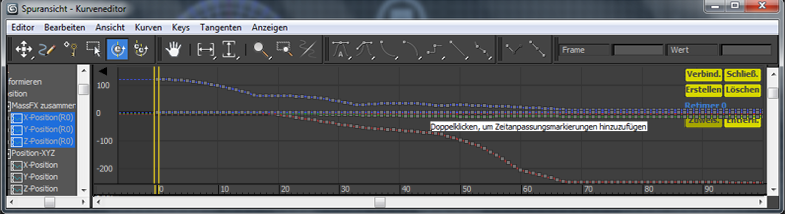 Tipp: Das Werkzeug Zeitänderung eignet sich optimal für die Zeitverkrümmung in bestimmten Objekten und Animationsspuren. Wenn Sie den Zeitablauf für alle animierten Objekte und Spuren in der Szene ändern möchten, verwenden Sie