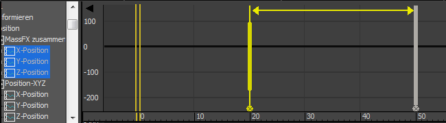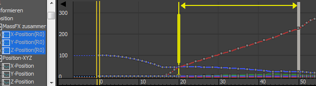 Nach der Zeitanpassung wird die Animation zwischen den Frames 20 und 34 auf die Frames 20 bis 50 erweitert.