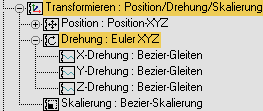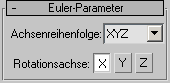 Der Euler-XYZ-Rotations-Controller ist ein zusammengesetzter Controller, der separate, einwertige Float-Controller kombiniert, um Rotationswinkel um die X-, Y- und Z-Achse festzulegen. Die Euler-XYZ-Rotation ist nicht so gleichmäßig wie die Quaternion-Rotation (die vom TCB-Rotations-Controller genutzt wird), aber es ist die einzige Rotationsart, die Sie zum Bearbeiten der Funktionskurven von Rotationen verwenden können.