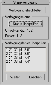 Das Rollout "Stapelverfolgung" des Dienstprogramms "Kameraverfolgung" führt eine automatische Verfolgung der Eigenschaften durch, wenn die Verfolger eingerichtet wurden. Sie können einen Satz von Verfolgern einrichten, die Stapelverfolgung für alle gemeinsam starten und dann mit den Hilfsmitteln in diesem Rollout nach Verfolgungsfehlern suchen und diese überprüfen. Über diese Gruppe kann auch überprüft werden, ob die Verfolgung abgeschlossen wurde.