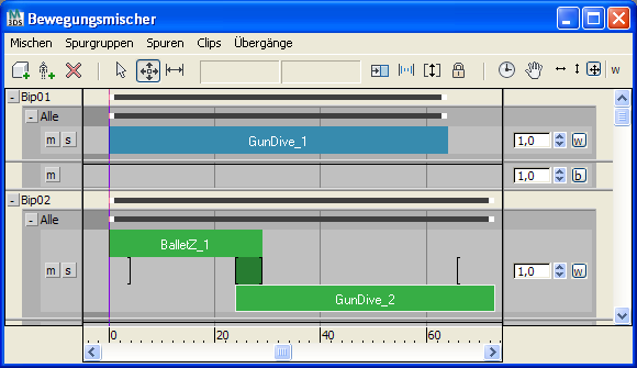 Alle Clips, die für ein bestimmtes Objekt importiert wurden, erhalten zur besseren Kennzeichnung eine nach dem Zufallsprinzip ausgewählte Farbe zugewiesen. So können z. B. alle Clips für einen Biped rot sein, während die für einen anderen Biped blau sind. Durch die unterschiedlichen Farbzuweisungen wird die Arbeit mit mehreren Bipeds und Nicht-Biped-Objekten im Bewegungsmischer erleichtert.