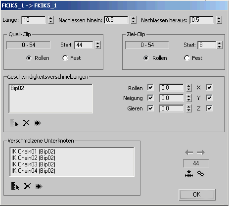 Ein Geschwindigkeitsverschmelzungsobjekt ist ein Objekt, dessen Positionen basierend auf der Geschwindigkeit verschmolzen werden (wie der Massenmittelpunkt eines Bipeds). Die für Geschwindigkeitsverschmelzung verwandten Objekte sind meist die Stämme der Mischungshierarchie. Wenn Sie ein Objekt zur Geschwindigkeitsverschmelzung heranziehen, wird dessen Animation entsprechend seiner Bewegungsbahn in der Szene gesammelt. Wenn Sie beispielsweise den Stamm der Figur als Verschmelzungsobjekt wählen, wird sichergestellt, dass die Animation der Figur relativ von Clip zu Clip verläuft, sodass sich die Figur im Weltkoordinatenraum bewegt und nicht jeder Clip wiederholt wird. Alle untergeordneten Objekte des Stamms folgen im Übergang.