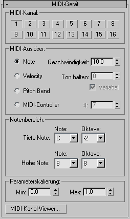 Enthält die Zahlenauswahlfelder "Min." und "Max.", die den Bereich der generierten Werte festlegen. Siehe dazu "Note" und "Geschwindigkeit" weiter oben.