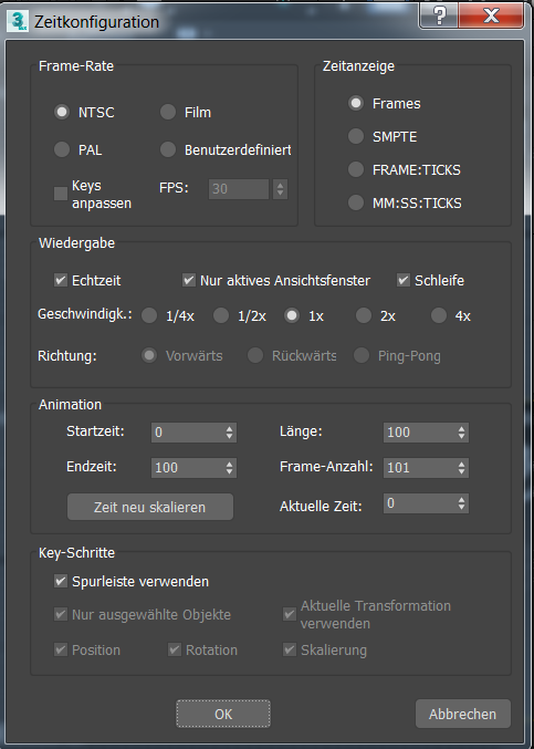 Im Folgenden sind die Steuerelemente des Dialogfelds "Zeitkonfiguration" aufgeführt. Sie können dieses Dialogfeld öffnen, indem Sie mit der rechten Maustaste auf eine der Schaltflächen für die Zeitsteuerung rechts neben der Auto-Key-Schaltfläche klicken.