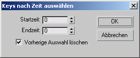 Mit dem Dienstprogramm Keys nach Zeit auswählen können Sie Keys in einem angegebenen Start- und End-Zeitbereich wählen. Sie können beispielsweise einen langen Zeitbereich auswählen, der sich im Key-Fenster der Spuransicht nur schwer mit der Maus auswählen lässt.