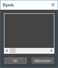 - Öffnet das Dialogfeld "Bipeds", alle Bipeds in der Szene auflistet. Wählen Sie einen oder mehrere Bipeds aus, um sie in das Fenster des Bewegungsmischers zu laden.