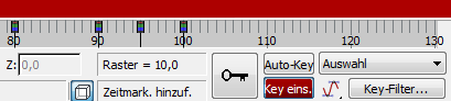 Positions-, Rotations- und Skalierungs-Keys können auch durch Klicken mit der rechten Maustaste auf den Frame-Indikator des Zeitschiebers festgelegt werden. Wenn Sie Keys für Parameter einstellen möchten, die über Zahlenauswahlfelder verfügen, halten Sie die Umschalttaste gedrückt, und klicken Sie mit der rechten Maustaste, um einen Key unter Verwendung des vorhandenen Parameterwerts einzustellen.