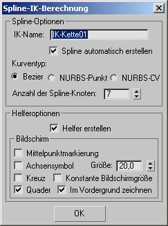 Nach der Bone-Erstellung wird das Dialogfeld "Spline-IK-Berechnung" angezeigt, sofern als IK-Berechnung die Spline-IK-Berechnung ausgewählt wurde und die Option "Unterg. Objekten zuweisen" aktiviert ist.