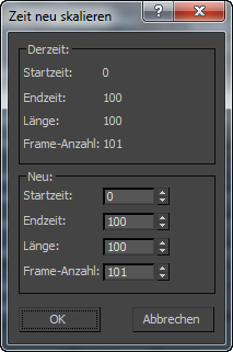 Bei der Zeitneuskalierung werden alle Keys in allen Spuren neu positioniert. Als Ergebnis wird die Animation über eine höhere oder niedrigere Anzahl von Frames abgespielt, wodurch sie schneller bzw. langsamer wird.