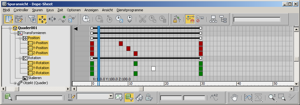 Der Dope-Sheet-Editor verwendet die Spuransicht, um die Animations-Keys im Zeitverlauf auf einer horizontalen Kurve anzuzeigen. Diese grafische Anzeige vereinfacht die Anpassung für die Animationszeitplanung, da Sie alle Keys in einem Tabellenformat gleichzeitig sehen können. Die alternative Spuransicht ist Kurveneditor, mit dem Sie zusätzlich zu den Keys Interpolationskurven verwenden können.