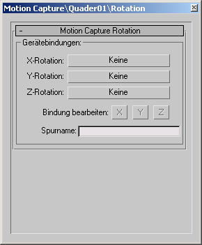 - Öffnen Sie nach dem Zuweisen des Motion Capture-Controllers das Eigenschaftsdialogfeld für die Spur, und binden Sie den Typ der Peripheriegeräte. Beispielsweise weist der Controller "Motion Capture Rotation" drei Rotationsachsen auf, an die Sie jeweils ein Gerät binden können.
