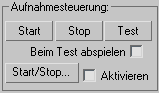 Mit diesen Optionen können Sie Ihre Animation testen und aufzeichnen. Die ersten drei Schaltflächen dienen zur direkten Steuerung der Aufnahme, während die Schaltfläche "Start/Stopp" die Steuerung der Aufnahme durch ein MIDI-Gerät gestattet.
