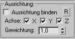 Verwenden Sie die Steuerelemente für gewichtungs- und achsenspezifische Bindungen, um verschiedene Gewichtungen für die einzelnen Bindungen zu erstellen und anzugeben, welche Achsen das gebundene Folgeobjekt beeinflusst. Verwenden Sie die R-Schaltflächen ("R" steht für "Relativ"), um mit "Position binden" und "Ausrichtung binden" einen relativen Abstand zu erstellen.