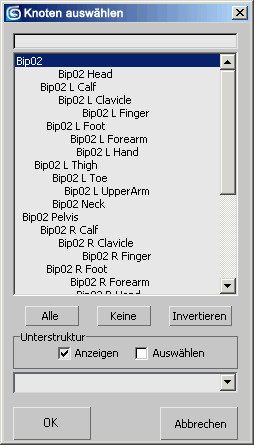 - In dieser Liste werden diebenannten Auswahlsätze der Szene aufgeführt. Wenn Sie in dieser Liste einen Auswahlsatz wählen, werden die darin enthaltenen Objekte in der Knotenliste ausgewählt.