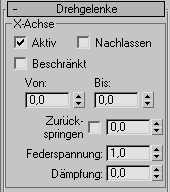 - Ein Gelenk setzt einer Bewegung Widerstand entgegen, wenn es sich den Grenzen "Von" und "Bis" nähert. Simuliert ein organisches Gelenk oder ein abgenutztes mechanisches Gelenk, das sich in der Mitte seines Bewegungsspielraums frei bewegt oder dreht, an den Rändern des Bereichs aber in der Bewegung eingeschränkt ist.