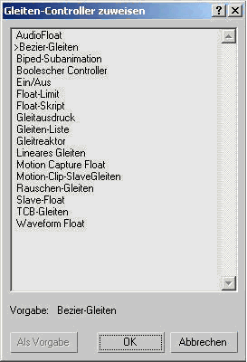 Untermenü Controller die Option Zuweisen aus. Ist ein Parameter schon animiert, tritt beim Zuweisen eines neuen Controllers eines der folgenden Ereignisse ein: