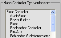 "Nach Controller-Typ ausblenden" enthält ein Fenster mit einer Liste aller Controller-Typen in 3ds Max. Wählen Sie einen oder mehrere Controller-Typen aus, damit sie nicht in der Hierarchieliste angezeigt werden. Sie können dazu die standardmäßigen Methoden für die Auswahl mehrerer Objekte verwenden, z. B. Klicken bei gedrückter STRG-Taste, Klicken bei gedrückter Umschalttaste oder Ziehen.