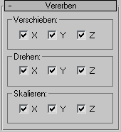 Das Rollout "Vererben" begrenzt, welche Transformationen ein untergeordnetes Objekt vererbt. Dieses Rollout beschränkt die Verknüpfungen zwischen einem ausgewählten Objekt und seinem übergeordneten Objekt für eine Positions-, Drehungs- oder Skalierungsachse.