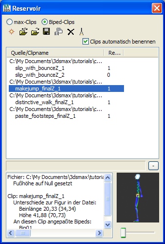 Das Fenster Clip-Status unten links im Reservoir enthält Informationen zur Verwendung eines bestimmten Clips. Sie können Dateiinformationen, wie den Speicherort der BIP- oder XAF-Datei, abrufen. Außerdem enthält das Feld auch Informationen zum Clip selbst, unter anderem den im Bewegungsmischer angezeigten Namen der Clip-Referenz. Darüber hinaus werden Informationen zur Biped-Struktur sowie die Bipeds angezeigt, an die die Clips angepasst wurden.
