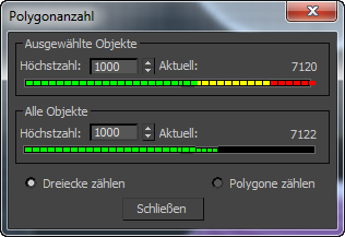 Zeigt die Anzahl der Flächen in der aktuellen Szene und die Anzahl der Flächen in der aktuellen Auswahl. Sie können für beide Werte einen Höchstwert festlegen.