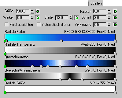 Die Verläufe für Streifeneffekte gleichen denen für andere Effekte, bis auf zwei: die Verläufe für Querschnittfarbe und Querschnitt-Transparenz. Diese Optionen sind nützlich, wenn die Streifenspitzen "weich" gezeichnet werden sollen. Beide Verläufe erstrecken sich vom Mittelpunkt der Streifenspitze bis zum Außenrand der Spitze.