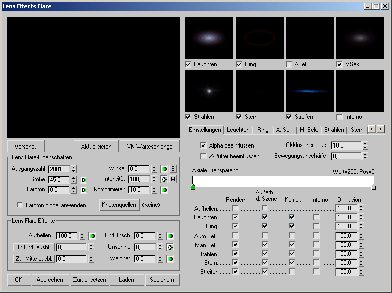 Hier können Sie das Lens Flare erstellen und steuern. Jede der neun Registerkarten enthält die Steuerelemente für einen bestimmten Aspekt des Linsenblendeffekts.