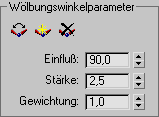 - Mit dieser Option legen Sie den Winkelbereich fest, in dem eine Wölbung die Haut beeinflusst. Bereich = 0 bis 180 %. Vorgabe = 90 Grad