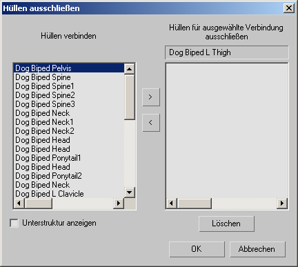 Mit diesem Dialogfeld auf der Unterobjektebene "Hülle" können Sie verhindern, dass bestimmte Verbindungen andere Verbindungen beeinflussen. Sie können beispielsweise ausschließen, dass die rechte Oberschenkelverbindung die linke Oberschenkelverbindung beeinflusst. Und statt die Zeigefingerhüllen zu skalieren, um einen Einfluss auf Mittelfingerscheitelpunkte zu verhindern, können Sie die Mittelfingerverbindungen von den Zeigefingerverbindungen ausschließen.
