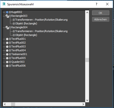 "Ausgewählte Spur" wählen, wird u. U. zunächst das Dialogfeld "Spuransichtsauswahl" geöffnet, in dem Sie aufgefordert werden, die Animationsspur auszuwählen, deren Attribut Sie bearbeiten möchten.