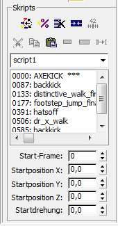 Mit den Optionen für Position, Drehung und Start-Frame bestimmen Sie die Position der Animation insgesamt. Wenn Sie das Skript für eine Figur in der Szene bearbeiten, die weitere Objekte oder Figuren enthält, können Sie mit diesen Steuerelementen die Position der Animation in Relation zur restlichen Szene festlegen.