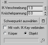 IK-Objekt auswählen Klicken Sie auf diese Schaltfläche, um ein Objekt für die Hand oder den Fuß des Bipeds auszuwählen, die ihm folgen sollen. Die Hand bzw. der Fuß folgen dem Objekt, wenn für die IK-Verschmelzung der Wert 1 festgelegt und Objekt ausgewählt ist.