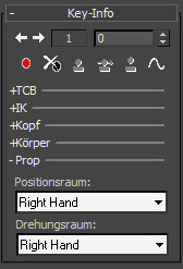 Requisiten können bei jedem beliebigen Keyframe die zugehörigen übergeordneten Objekte (ähnlich dem Verknüpfungs-Controller in 3ds Max) wechseln. Diese Einstellung wird über die Listen "Positionsraum" und "Koordinatenraum" im Abschnitt "Requisite" im Rollout "Key-Info" vorgenommen. Wenn ein Key bei einem gegebenen Frame für die Requisite eingestellt ist, können Sie den Koordinatenraum, in dem er transformiert wird, einstellen oder ändern, indem Sie einen neuen Raum aus der Dropdown-Liste auswählen. Den Drehungs- und den Positionskoordinatenraum stellen Sie unabhängig voneinander ein.