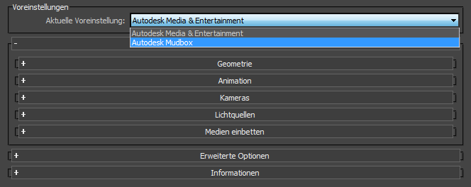 Die Standard-Voreinstellung für das 3ds Max-Exportprogramm ist "Autodesk Media and Entertainment".