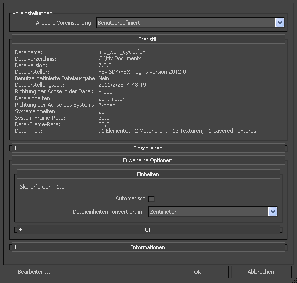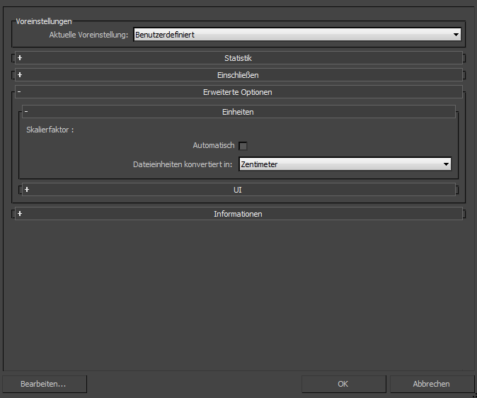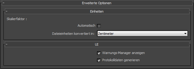 Aktivieren Sie die Option Automatisch, wenn das 3ds Max FBX plug-in die Einheiten der eingehenden Datei automatisch erkennen und entsprechend den Einheiten der Host-Anwendung einstellen und konvertieren soll.