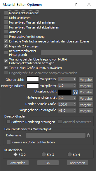 - Damit werden ohne Schließen des Dialogfelds "Material-Editor-Optionen" die aktuellen Einstellungen angewendet, mit Ausnahme der Änderungen im Bereich "Musterfelder". Diese Funktion ist praktisch, wenn Sie Lichtwerte für die Musterfelder anpassen.