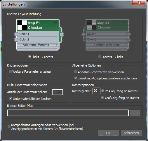 - Wenn Probleme mit der Anzeige des erweiterten Material-Editors auftreten und Ihr System eine ältere Grafikkarte verwendet, aktivieren Sie diese Option, um die Darstellung des Material-Editors zu verbessern. Vorgabe = Deaktiviert.