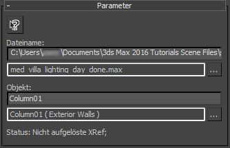 Dieses Feld zeigt den Pfad und Dateinamen der Szenedatei an, die die Quelle des XRef-Materials enthält. Sie können dieses Feld bearbeiten und auf einen anderen Pfad oder eine andere Datei verweisen.