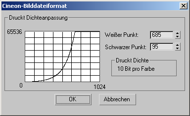Repräsentiert die Übergangsfunktion vom Dichtedruck (10 Bit-Protokoll) zu 16 Bit linear, wobei der weiße Punkt durch Mapping auf einen maximalen Codewert von 65535 gebracht wird.