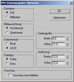 3ds Max kann Bilder in Dateien des Dateiformats "Encapsulated PostScript"® rendern, die die Erweiterung .eps oder .ps haben.