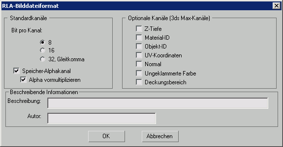 Wenn RLA als Ausgabeformat gewählt ist, wird durch Klicken auf "Rendern" oder "Setup" im Dialogfeld "Render-Ausgabedatei" das Dialogfeld "RLA-Bilddateiformat" angezeigt.