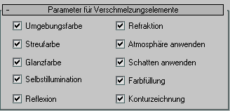 Als Vorgabe sind alle Elemente in diesem Rollout aktiviert, und die Renderausgabe der Verschmelzung stimmt mit Ausnahme des Szenenhintergrunds mit der vollständigen normalen Renderausgabe überein. Stellen Sie mithilfe der Kontrollkästchen Ihre eigene Kombination von Elementen für die Renderausgabe der Verschmelzung zusammen.