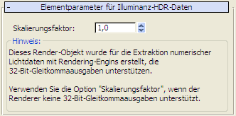 Legt den Skalierungsfaktor für das Rendern von Illuminanzdaten fest. (Nicht erforderlich, wenn Sie einen Renderer verwenden, der 32-Bit-Ausgaben generiert.)