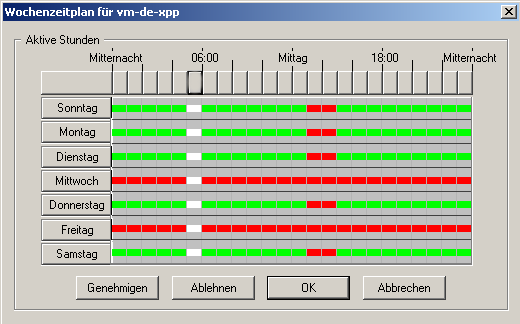 Vorgabemäßig sind alle Server zu jedem Zeitpunkt verfügbar. Mit der Funktion "Wochenzeitplan" der Warteschlangenüberwachung können Sie die Zeiten festlegen, in denen die einzelnen Server für das Netzwerk-Rendern verfügbar sind.
