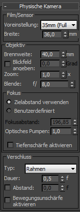 Anmerkung: Wenn die Option Blickfeld angeben aktiviert ist, ist die Option Brennweite deaktiviert. Wenn Sie jedoch den Wert eines dieser Steuerelemente ändern, ändert sich auch der Wert des anderen Steuerelements.