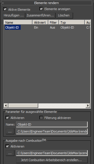 - Klicken Sie auf diese Option, um die Renderelemente aus einer anderen 3ds Max-Szene zu importieren. Über die Option "Zusammenführen" wird ein Dateidialogfeld angezeigt, in dem Sie die Szenendatei angeben können, aus der die Elemente abgerufen werden sollen. Die Liste der Renderelemente in der ausgewählten Datei wird der aktuellen Liste hinzugefügt.
