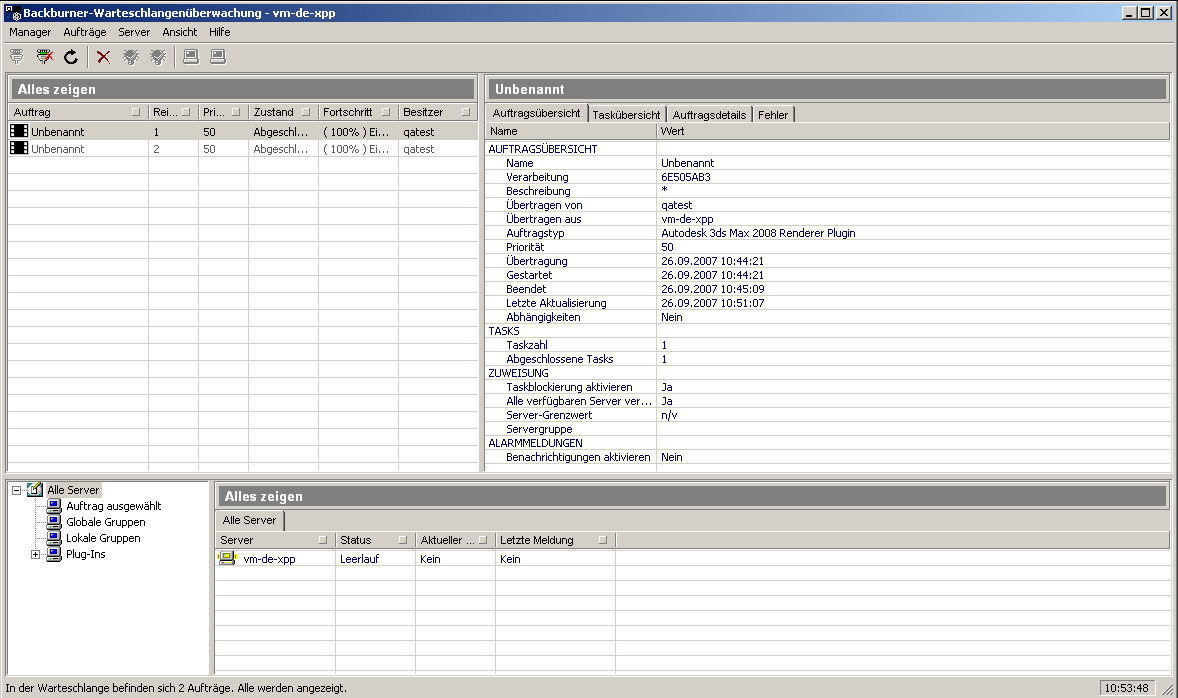 Verwenden Sie dieses Menü, um Informationen zu Renderaufträgen abzurufen. Die meisten Funktionen im Menü "Aufträge" sind nur verfügbar, wenn mindestens ein Auftrag in der Auftragsliste markiert wurde. Viele Funktionen erfordern, dass nur ein Auftrag markiert ist.