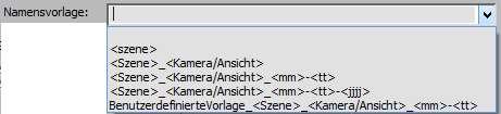 In diesem Textfeld können Sie neue Vorlagen erstellen. Sie könnten beispielsweise <Szene >_<tt>_<mm > in <tt>_<mm >_<Szene> ändern. Jeder Text, den Sie eingeben, wird der Namensvorlage hinzugefügt. 3ds Max kann bis zu 10 benutzerdefinierte Vorlagen speichern (ohne Vorgabenvorlagen, die immer in der Liste angezeigt werden). Wenn die maximale Anzahl der benutzerdefinierten Vorlagen gespeichert wurde, bewirkt das Eingeben einer neuen Vorlage, dass die erste gespeicherte benutzerdefinierte Vorlage aus der Liste entfernt wird.