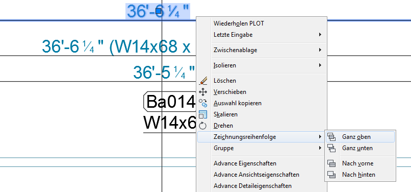 Sie müssen möglicherweise den AutoCAD-Befehl REGEN verwenden, wenn Sie Zeichnungen aus vorherigen Versionen öffnen. Führen Sie die erforderlichen Änderungen am Zeichnungsstil aus, um den Bemaßungshintergrund zu aktivieren. Der REGEN-Befehl wird auch verwendet, wenn die Vorgabe des Management Tools aktiviert ist, während die Zeichnung in einer aktuellen Advance Steel-Sitzung geöffnet ist. Die Kohärenz der Bemaßungs- und Beschriftungshintergründe hängt von der Zeichnungsreihenfolge ab, in einigen bestimmten Fällen müssen Sie die Zeichnungsreihenfolge manuell mithilfe des AutoCAD-Befehls Ganz oben überschreiben, um das gewünschte Ergebnis zu erhalten.
