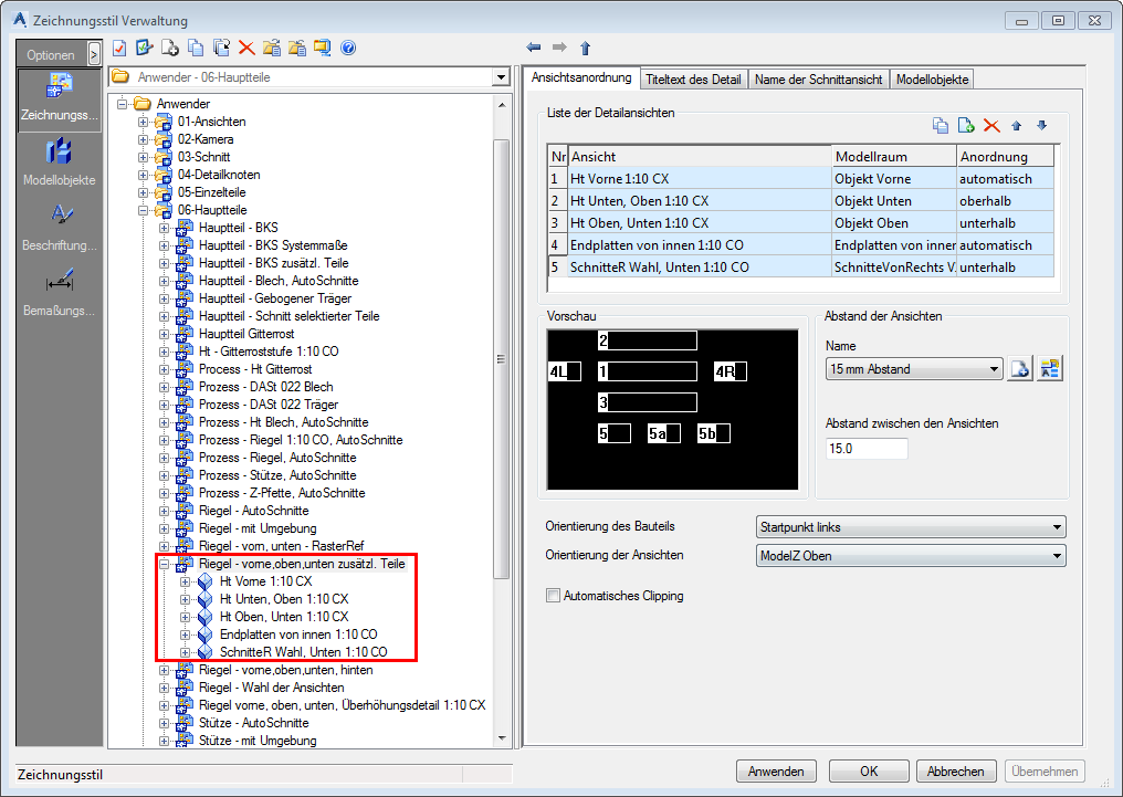 Ein Zeichnungsstil setzt sich aus einer oder mehreren Ansichten zusammen. Zu einer Ansicht gehören Eigenschaften, Objekte, Bemaßungen und Beschriftungen. Darüber hinaus stehen im Eigenschaftenbereich Eigenschaften für den Zeichnungsstil zur Verfügung.